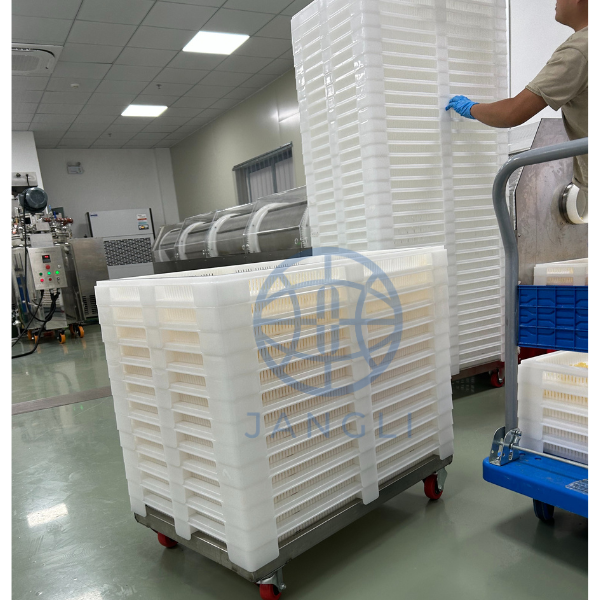 - To solve these existing problems, JANGLI developed Intelligent dehumidification softgel tumble dryers in 2019 and this new style of softgel drying method is becoming more and more popular these years. This tumble dryer is closed structure with built-in dehumidifier and water cooling unit and no need to control the whole drying room temperature and humidity, it control the temperature and humidity inside the tumble dryer drying basket directly and so that the room needed to be control the temperature and humidity is much more smaller and we can concentrate all energy to control a smaller space. And thus we can realize very good drying effect in a shorter time and at the same time a 10’’ softgel machine 24 hours production needs only 24 basket of dryer for non-stop softgel production.