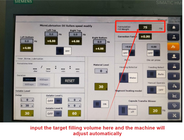 - For traditional gear driving machine, the filling volume of the soft capsules is adjusted manually, which also need at least 2 operators, and 1 operator need to rotate the adjusting knob manually slowly and the other operator need to weigh the capsule, and they need to keep doing this until the filling volume is correct. This cost too much time and waste a lot of raw material.