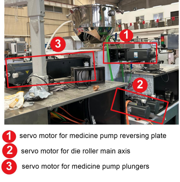 - The last one is the servo motor for the reversing plate, this is JANGLI’s unique design–servo motor for the medicine reversing pump. Servo motor direct driving to replace the traditional gear driven cam makes the softgel machine runs more stable, so that the rotating speed of the machine can be faster.